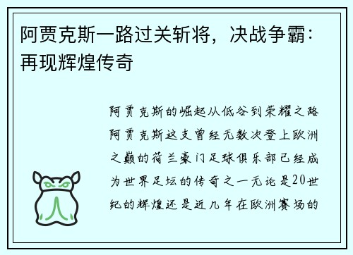 阿贾克斯的决战争霸:迎接挑战,展现无限潜力